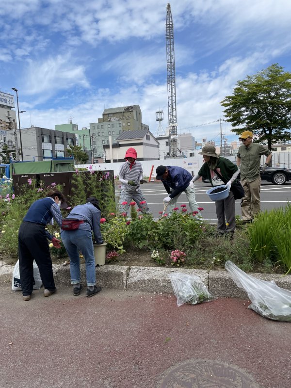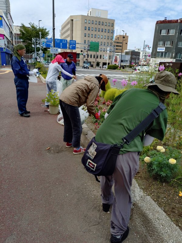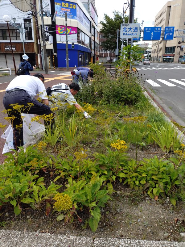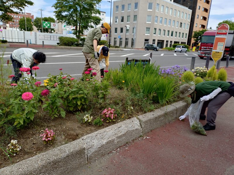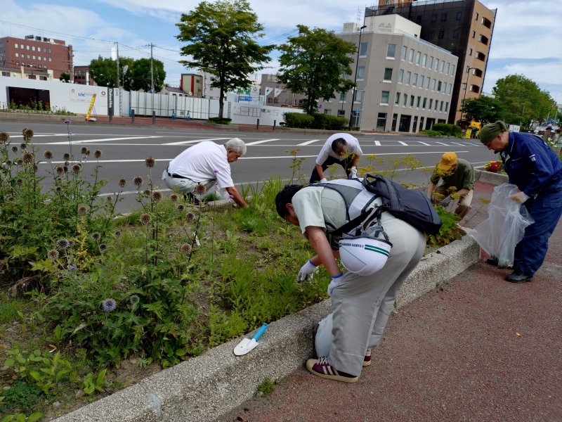 釧路土地家屋調査士会(松田整会長)と公益社団法人釧路公共嘱託登記土地家屋調査士協会(瘧師敏幸理事長)は市民団体「霧・ワイルドフラワーファンクラブ」の後援スポンサーとして、参加者全員で花壇整備やごみ拾いを行いました。